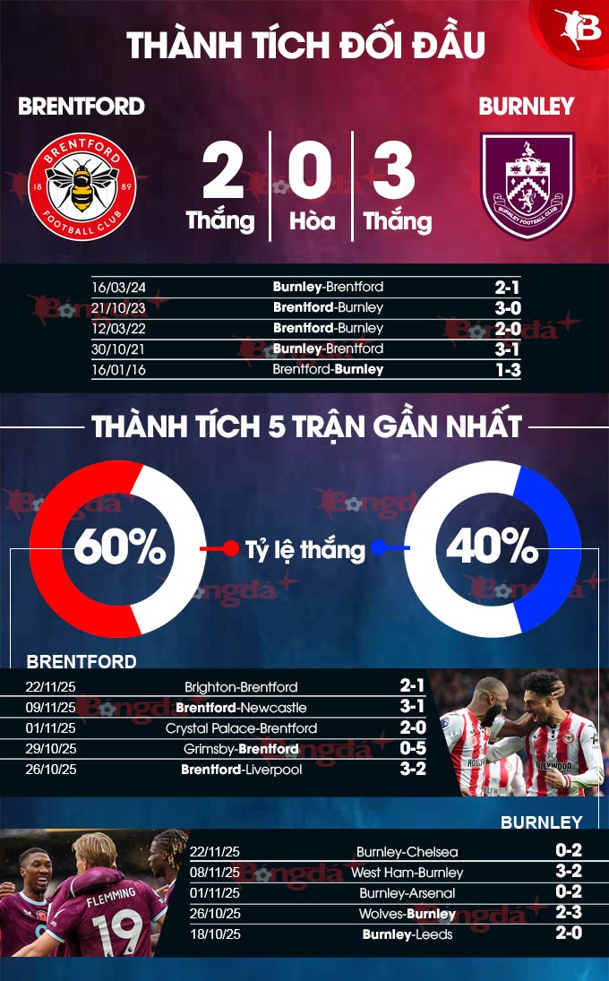 - Nhiều bàn thắng: 4/5 trận gần đây của Brentford cùng 5/8 trận vừa qua của Burnley đều có từ 3 bàn thắng trở lên. 4/5 trận đối đầu gần nhất giữa hai đội cũng xuất hiện tối thiểu 3 pha làm bàn.