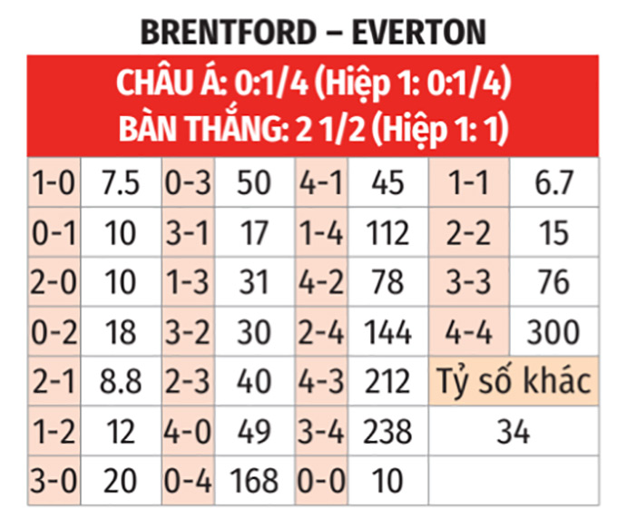 - Tối đa 2 bàn: 3/4 trận sân nhà gần đây của Brentford đều chỉ có tối đa 2 bàn. 3/4 trận gần nhất giữa đội bóng này và Everton số lần lưới rung cũng không hơn được 2.