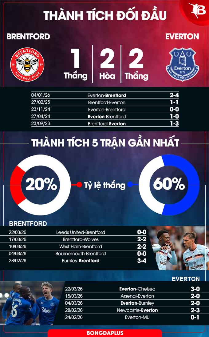 Xét về thành tích đối đầu, đội bóng của HLV Moyes cũng không hề e ngại Brentford khi đã bất bại 3 lần gần nhất làm khách tại sào huyệt đối phương. Với 8 bàn thắng trong 4 trận gần nhất, hàng công Everton rõ ràng đang vào phom và vì thế sẽ chẳng dễ để Brentford kiếm trọn 3 điểm.