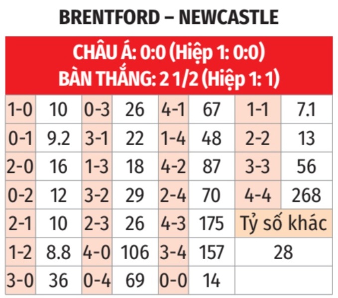 - Chẵn bàn thắng: 3/4 lần đối đầu giữa 2 đội gần đây kết thúc với tổng số bàn thắng là số chẵn. 5/7 trận gần đây của Brentford tại các giải chính thức và 5/6 trận sân khách vừa qua của Newcastle xảy ra tình trạng tương tự.