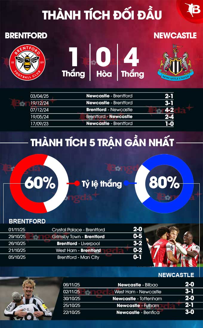 Trong khi đó, Brentford gần đây thi đấu khá ổn. Cụ thể, họ thắng 3/4 trận đấu trở lại đây. Đáng chú ý, đoàn quân của HLV Keith Andrews từng gây sốc khi đánh bại Liverpool hồi cuối tháng 10 với tỉ số 3-2. Nhờ đó, Brentford vượt lên xếp ngay trên Newcastle tại bảng xếp hạng Premier League.