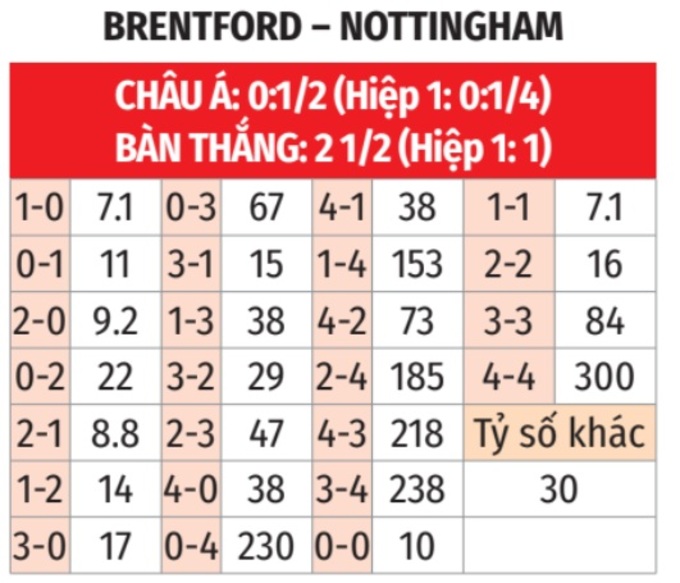 - Tối thiểu 1 bàn hiệp 1: 4 lần gặp giữa hai đội gần đây đều có từ 1 bàn thắng trở lên trong hiệp 1. Tình trạng tương tự xảy ra ở 4 trận gần đây của Brentford và 4/5 trận sân khách vừa qua của Nottingham Forest.