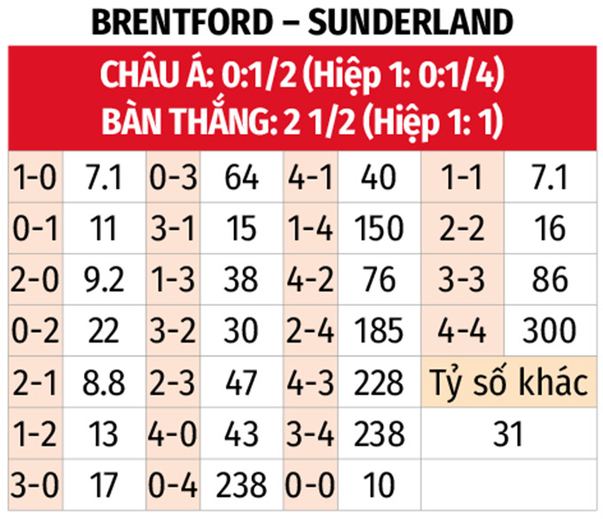 - Tối đa 1 bàn hiệp 1: 10/13 trận gần đây của Brentford cùng 5 trận liên tiếp của Sunderland đều có tối đa 1 bàn thắng trong 45 phút đầu tiên. Trận đối đầu ở lượt đi thâm chí xuất hiện tỷ số 0-0 trước giờ nghỉ dù có tới 3 trận được ghi sau 90 phút bóng lăn.