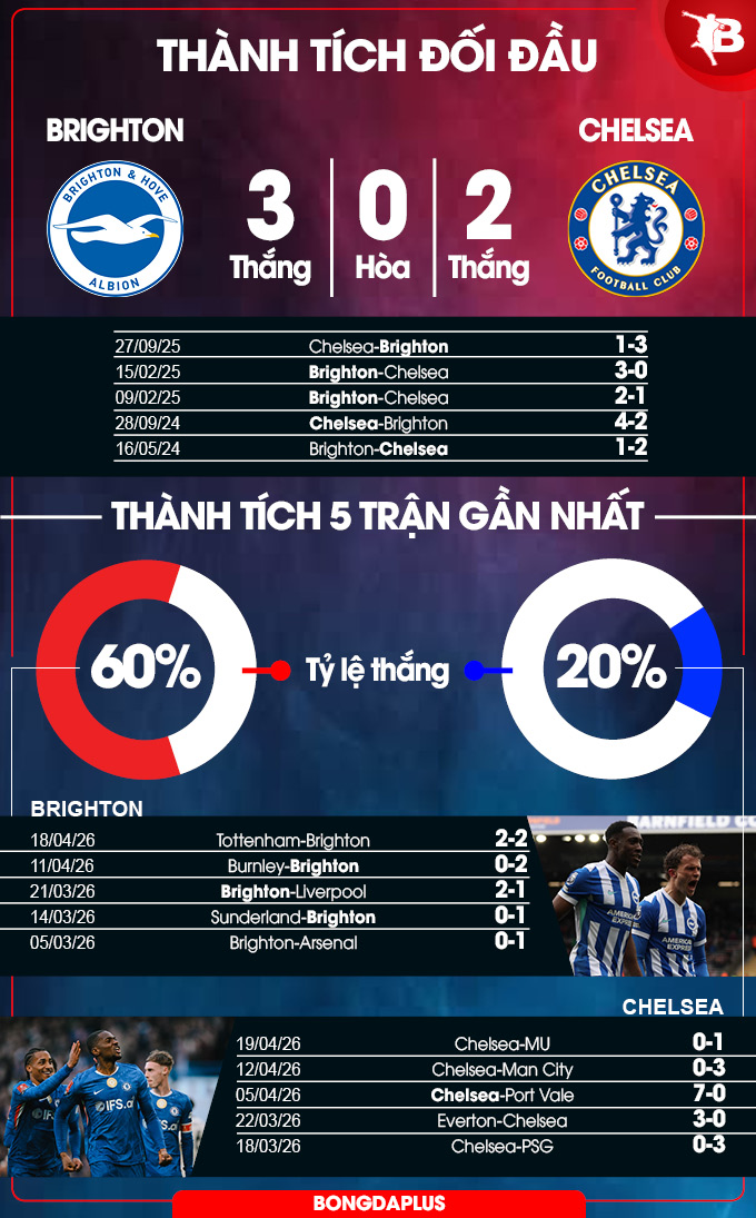 Tuy vậy. Brighton không phải là đối thủ dễ bắt nạt. Chim mòng biển toàn thắng cả 3 lần đối đầu gần nhất với Chelsea; thắng 5, hòa 1 và chỉ thua 1 ở 7 vòng đấu gần đây tại giải đấu số 1 mảnh đất xứ sở sương mù.