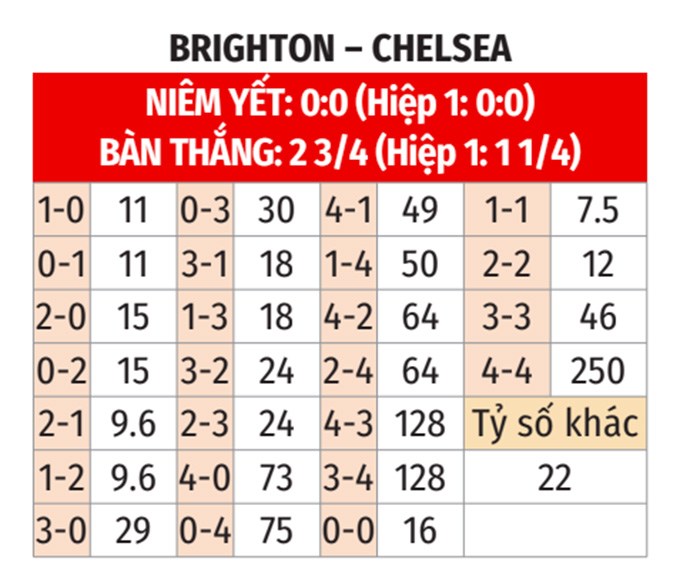 Với những phân tích nói trên, nhiều khả năng Chelsea sẽ phải nhận một thất bại nữa tại Premier League mùa này. Hai đội cùng ghi bàn, tổng lẻ bàn thắng và Brighton ghi bàn trong hiệp 1 là những kịch bản dễ xảy ra tại trận đấu lần này.