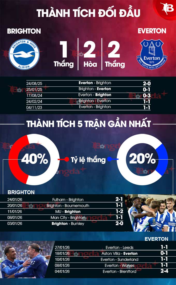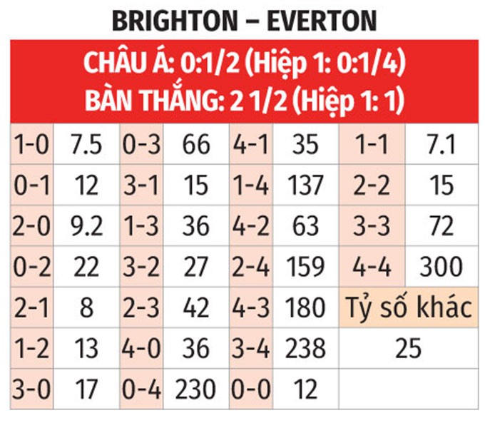 - Ít bàn thắng: 4 trận sân nhà liên tiếp gần đây của Brighton cùng 4 trận vừa qua của Everton đều có nhiều nhất 2 bàn thắng được ghi. 4/5 trận đối đầu gần nhất giữa đôi bên cũng xuất hiện tối đa 2 pha làm bàn.