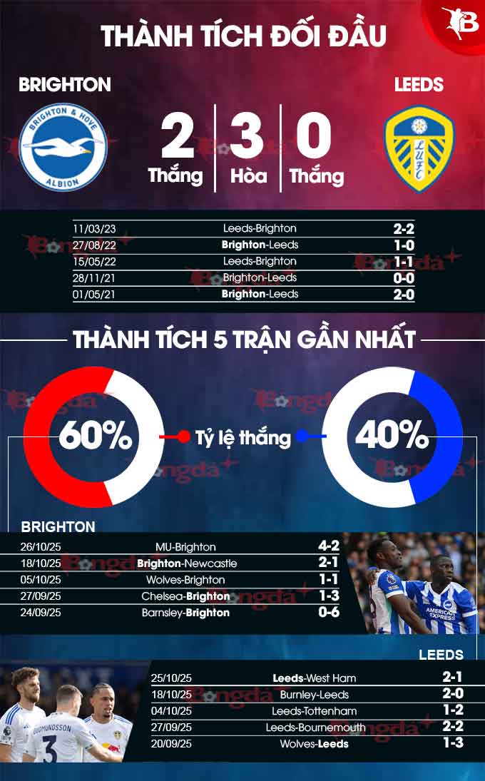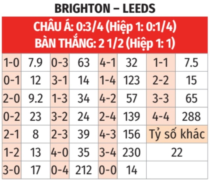 - Tối thiểu 3 bàn thắng: 8/10 trận đấu của Brighton gần đây đều xuất hiện ít nhất 3 bàn thắng. Tình trạng tương tự xảy ra ở 4/5 trận đấu vừa qua của Leeds.