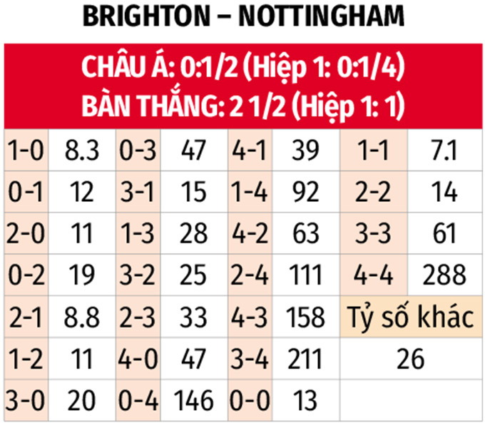 - Nhiều nhất 1 bàn hiệp 1: 9/10 trận gần đây của Brighton cùng 3/4 trận vừa qua của Nottingham có tối đa 1 bàn thắng được ghi trong 45 phút đầu. 2 trận đối đầu gần nhất giữa đôi bên chỉ có 1 bàn thắng trong hiệp 1.