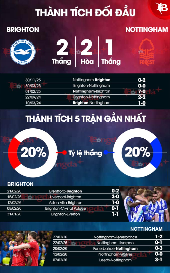 - Ít bàn thắng: 4/5 trận gần đây của Brighton đều có không quá 2 bàn thắng được ghi. 4/5 trận vừa qua của Nottingham tại Ngoại hạng Anh cùng 2 trận đối đầu gần nhất cũng có tối đa 2 pha làm bàn.