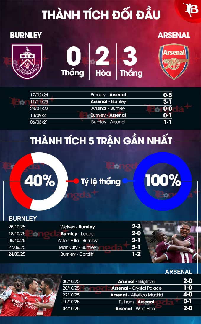 Trên sân Turf Moor của Burnley, Arsenal đang bất bại ở 10 trận gần nhất tại mọi đấu trường, với 7 chiến thắng và 3 trận hòa. Và, ở 18 lần đụng độ gần nhất với Arsenal tại Ngoại hạng Anh, Burnley chỉ thắng đúng 1 lần (hòa 4, thua 13). Đó là chiến thắng 1-0 tại Emirates vào tháng 12/2020.