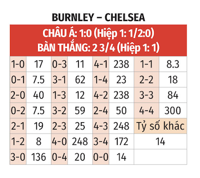 - Tối thiểu 1 bàn hiệp 1: 15/20 trận gần nhất của Burnley có tối thiểu 1 lần lưới rung hiệp 1. 17/20 trận gần nhất của Chelsea có kịch bản tương tự. NHM nên đợi sau 15 phút đầu rồi tin tưởng tỷ lệ nhiều bàn hiệp 1.