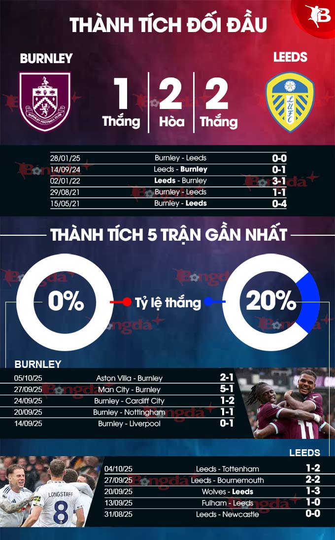 Chưa hết, thành tích đối đầu giữa 2 CLB gần đây có phần nghiêng về Leeds. Do đó, khả năng, Leeds sẽ có niềm vui tại sân Turf Moor.