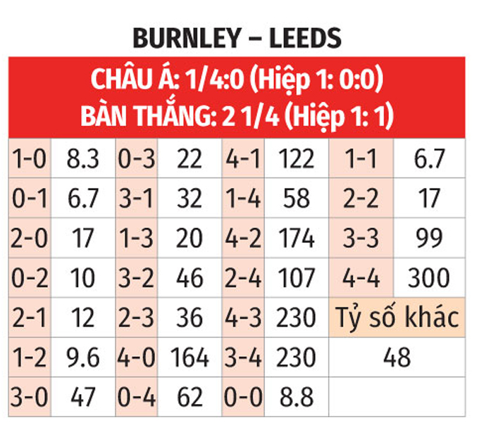 0 - 4 trận gần nhất gặp Leeds, Burnley đều không thắng. Họ hòa 3 và thua 1. Tổng bàn thắng ở 4 trận này chia hết cho 2.