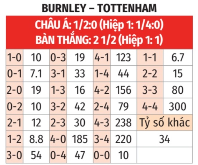- Tối thiểu 1 bàn hiệp 1: 4/5 lần gặp giữa 2 đội gần đây đều có từ 1 bàn thắng trở lên trong hiệp 1. Tình trạng tương tự xảy ra ở 5 trận gần đây của cả Burnley lẫn Tottenham.