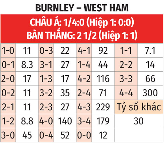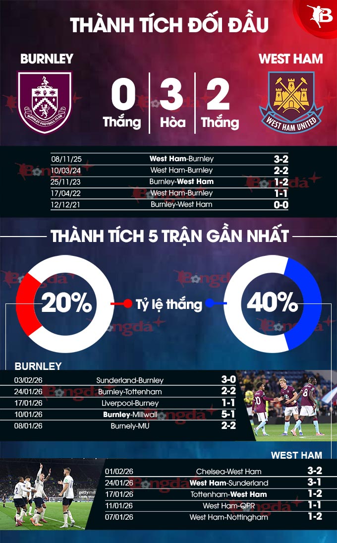 Burnley có lợi thế sân nhà nhưng lại chẳng có thành tích tốt tại đây khi chỉ thắng 1/9 trận gần nhất. So về đối đầu, West Ham nhỉnh hơn đối thủ khi thắng 4, hòa 3 trước Burnley ở 7 trận vừa xong.