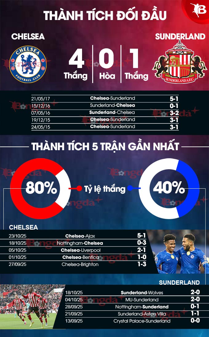 - Chelsea ghi bàn hiệp 1: Chelsea luôn ghi được ít nhất 1 bàn trong hiệp 1 ở 6/7 cuộc đối đầu gần nhất, ở 8/10 lần gần đây đón tiếp Sunderland trên sân nhà ở Ngoại hạng Anh. Ngoài ra, Chelsea cũng làm được điều tương tự ở 4/5 trận vừa qua, ở 11/13 trận sân nhà vừa qua.