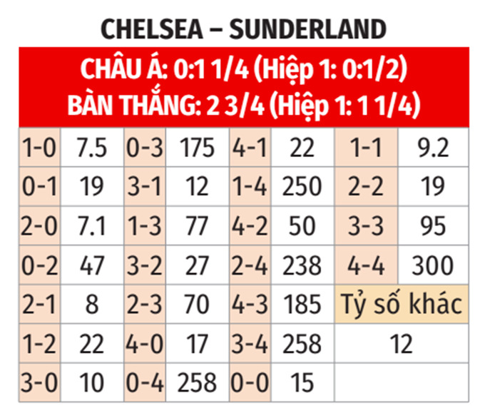 - Chẵn bàn thắng: 5/8 cuộc đối đầu gần nhất đều khép lại với tổng bàn thắng là chẵn. Hơn nữa, 5/8 trận sân nhà gần đây của Chelsea và 6/8 trận vừa qua của Sunderland cũng khép lại với tổng bàn thắng chia hết cho 2. Ngoài ra, 3/4 chuyến làm khách gần nhất tại Ngoại hạng Anh của Sunderland cũng có kết cục tương tự.