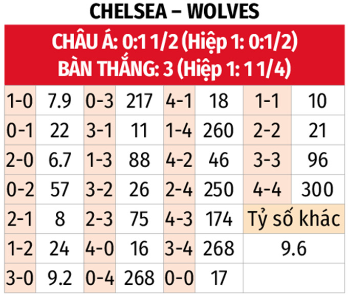 - Ít nhất 2 bàn hiệp 1: Lịch sử đối đầu đang chứng kiến 4 trận đối đầu gần nhất giữa hai đội đều có từ 2 đến 3 bàn thắng trong 45 phút đầu tiên. Kịch bản này hoàn toàn có thể tái diễn, khi 4/5 trận vừa qua của Chelsea cùng 2/3 trận vừa qua của Wolves cũng có tối thiểu 2 bàn trước giờ nghỉ.