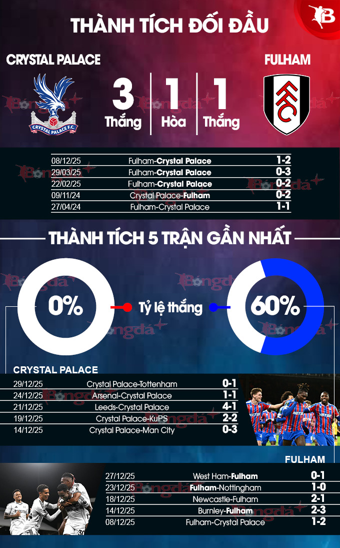 Đại bàng cũng chỉ thắng 4/20 trận sân nhà gần nhất tại Premier League vào tháng 1 (4 hòa, 12 thua), bao gồm 2 chiến thắng trước Sheffield United (2-0, năm 2021; 3-2, năm 2024) và các chiến thắng trước Burnley (1-0, năm 2018) và Wolves (1-0, năm 2021). Trong khi đó, Fulham đã thắng cả ba trận gần nhất tại Ngoại hạng Anh.