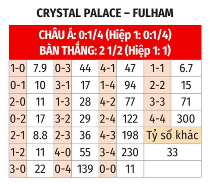 - Lẻ bàn thắng: Cả 2 cuộc đối đầu gần nhất, 8/10 trận gần đây của Crystal Palace và 9/10 trận vừa qua của Fulham đều khép lại với tổng bàn thắng là lẻ. Ngoài ra, 5/7 chuyến làm khách gần đây của Fulham cũng có tổng bàn thắng không chia hết cho 2.