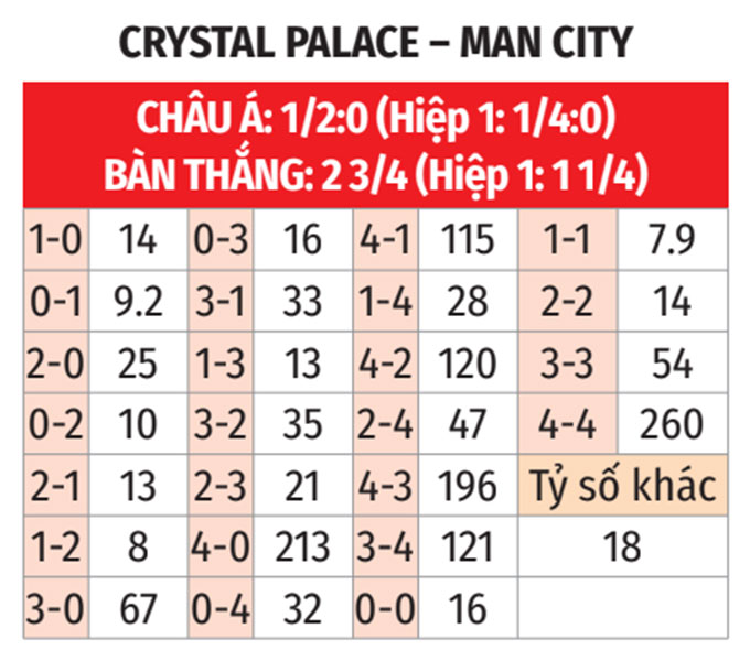 - Tỷ số lẻ: Cả 4 trận gần đây của Man City đều kết thúc với tỷ số lẻ. 5 trận vừa qua của Crystal Palace cũng diễn ra theo kịch bản tương tự.