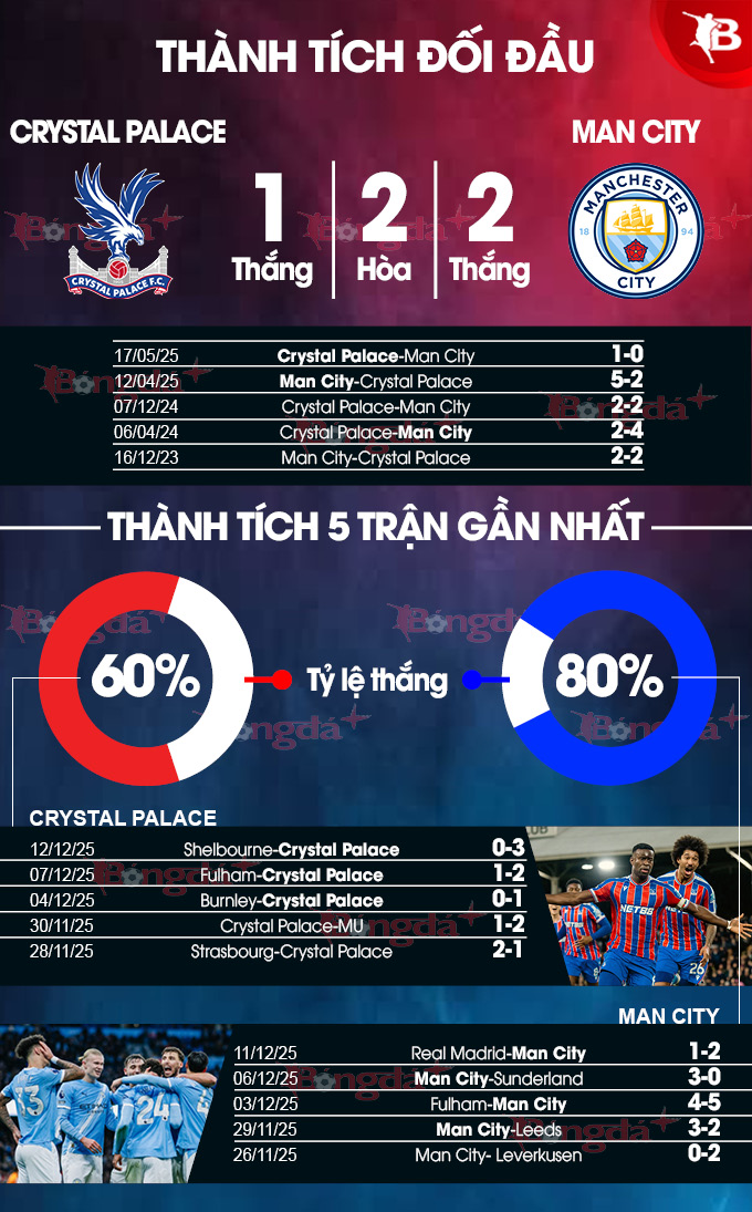 Nếu chỉ tính thành tích sân nhà, thì Man City đang làm tốt nhất ở giải Ngoại hạng Anh, trong khi Crystal Palace xếp tận vị trí thứ 15 trên BXH. Chi tiết trên chứng tỏ yếu tố địa lợi không phải ưu thế lớn với Crystal Palace, nên nếu họ có trắng tay trước Man City thì đây cũng không phải là chuyện lạ.