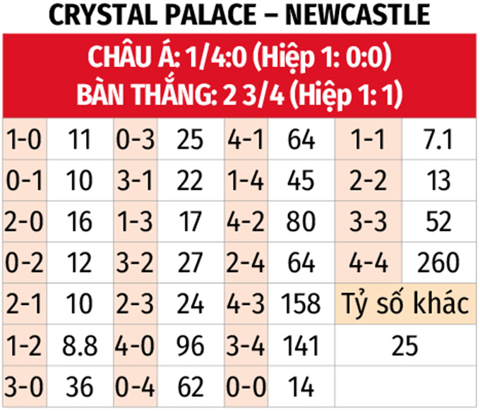 - Tối đa 1 bàn hiệp 1: 4/5 trận gần đây của Crystal Palace có không quá 1 bàn thắng trong hiệp 1, trong đó có 3 trận hòa 0-0. 3/4 trận vừa qua của Newcastle cũng xuất hiện nhiều nhất 1 pha làm bàn trong 45 phút đầu. Chưa kể, 7/10 trận đối đầu gần nhất thậm chí không có bàn trước giờ nghỉ.