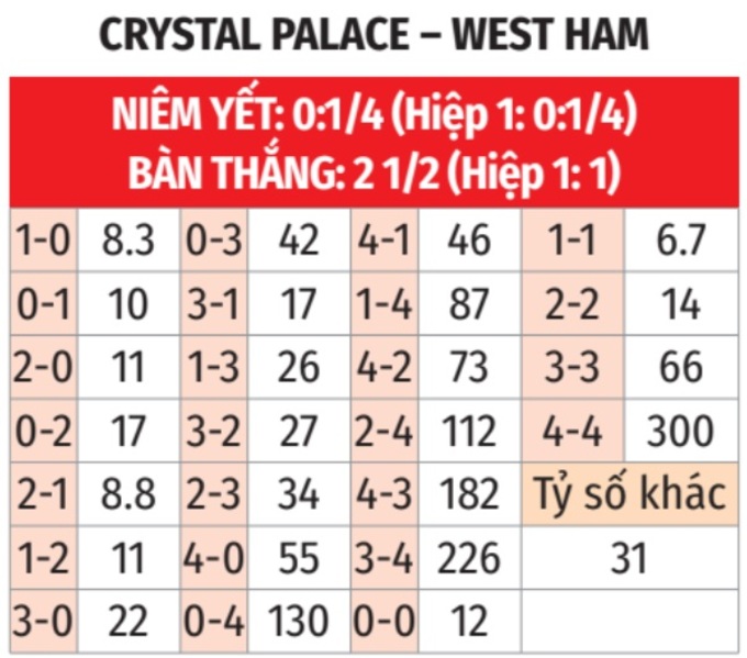 - Tối thiểu 1 bàn hiệp 1: 8/10 lần gặp giữa 2 đội gần đây đều có từ 1 bàn thắng trở lên trong hiệp 1. Tình trạng tương tự xảy ra ở 7/9 trận gần đây của Crystal Palace và 6/7 trận mới nhất của West Ham.