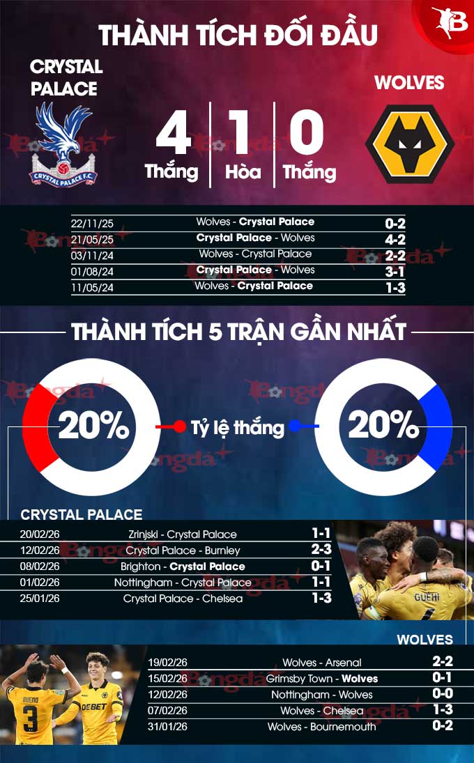 Tuy nhiên, Wolves đã thua 8/10 trận gần nhất tại Premier League trước Crystal Palace (thắng 1, hòa 1), trong khi họ chưa bao giờ thắng được Đại bàng ở giải đấu này khi không giữ sạch lưới (hòa 2, thua 9).
