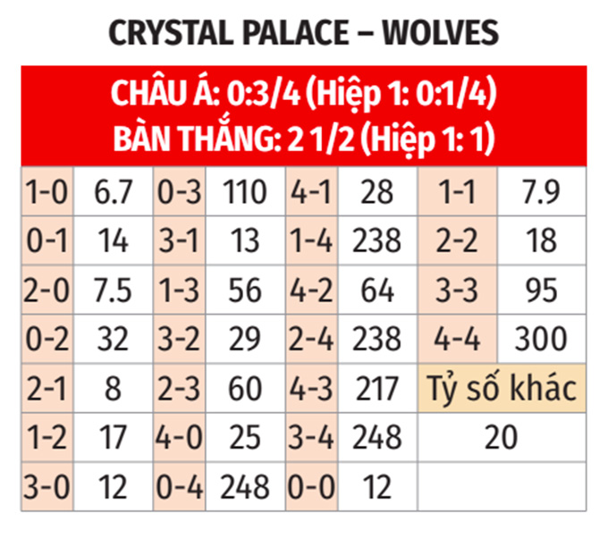 Với tương quan lực lượng hiện tại, thành tích đối đầu và phong độ gần đây khá chênh lệch, nhiều khả năng Crystal Palace sẽ thắng theo châu Á, giữ sạch lưới nhà trước Wolves lần này.