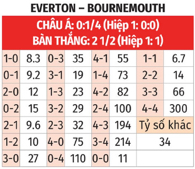 - Tối đa 1 bàn hiệp 1: 5/6 trận đối đầu gần nhất đều kết thúc hiệp đầu tiên với tỷ số 0-0. 10 trận liên tiếp của Everton cùng 4/5 trận vừa qua của Bournemouth đều có tối đa 1 bàn thắng trong hiệp một.