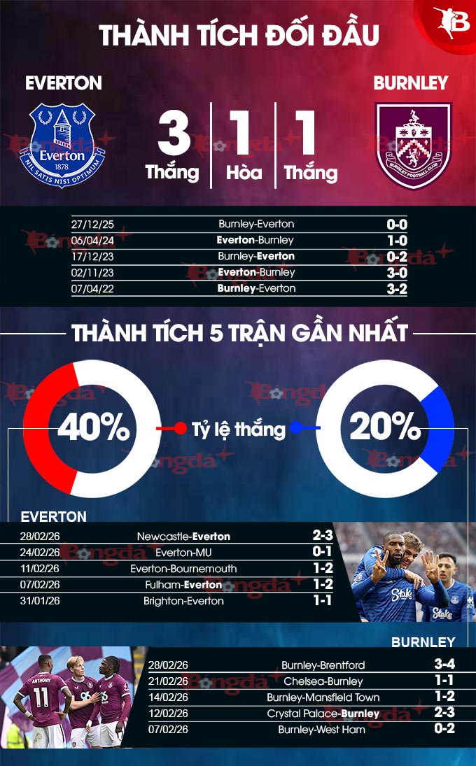 Do đó, Everton rất cần phải cải thiện thành tích sân nhà, chấm dút chuỗi 6 trận không thắng (2 hòa, 4 bại) tại sân Hill Dickinson (chỉ tính Premier League). Thật lý tưởng nếu họ làm được điều này trước Burnley, đội bóng đang có thành tích rất tệ trên sân đối phương.
