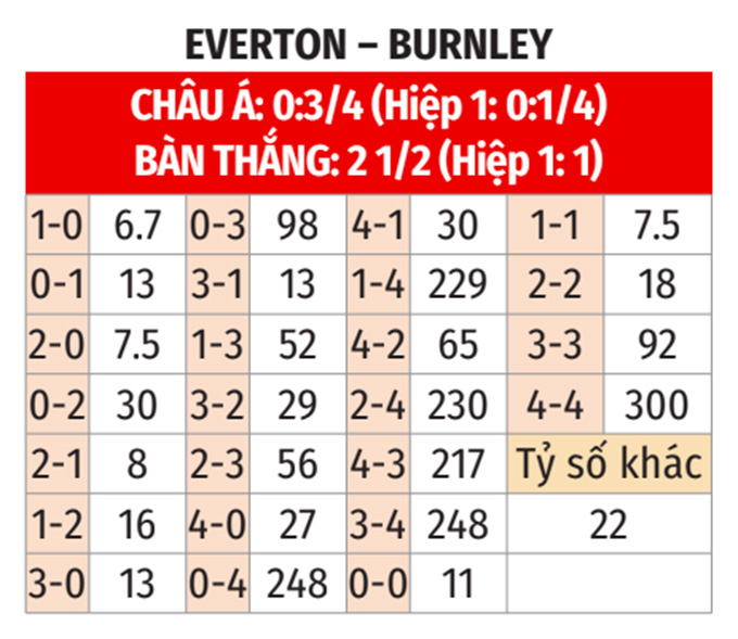 - Lẻ bàn thắng: 4/5 cuộc chạm trán gần nhất tại Everton, cả 4 trận vừa qua của Everton và 3/4 trận gần đây của Burnley đều có tổng bàn thắng là lẻ. Khả năng trận này cũng có kịch bản tương tự.