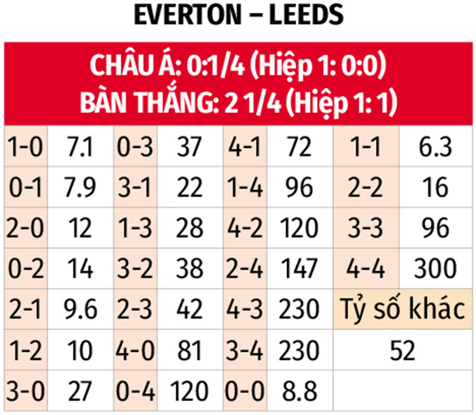 - Hai đội cùng ghi bàn: Đây là một lựa chọn hoàn toàn khả thi xét đến màn trình diễn tấn công gần đây và những điểm yếu trong phòng ngự của cả hai đội. Everton đã ghi bàn trong 3 trận đấu gần nhất tại Ngoại hạng Anh, trong khi Leeds đã ghi bàn ở 4 trong 5 trận đấu gần đây của họ tại giải đấu này. Ở hàng thủ, Leeds để thủng lưới 24 bàn trên sân khách từ đầu mùa, nhiều thứ 3 chỉ hơn Buremouth (30) và Burnley (27).