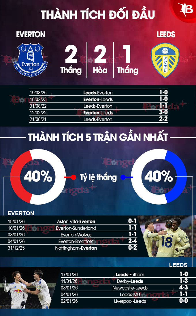 - Ít bàn thắng: 7/8 trận gần đây của Everton cùng 4/5 trận vừa qua của Leeds tại Ngoại hạng Anh đều có không quá 2 bàn thắng được ghi. Lịch sử cũng chứng kiến 3 trận gặp nhau gần nhất có tối đa 2 lần lưới rung.