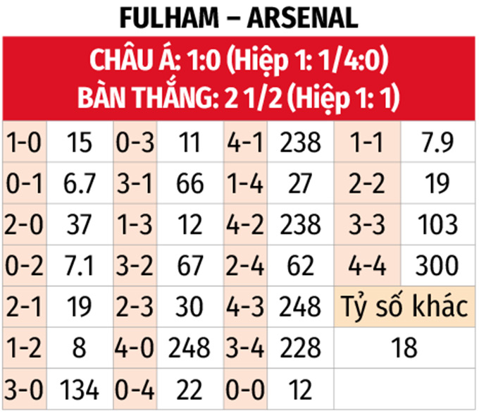 - Tối thiểu 1 bàn hiệp 1: 4/6 trận gần đây của Fulham cùng 8 trận liên tiếp vừa qua của Arsenal đều có tối thiểu 1 bàn thắng trước khi bước vào giờ nghỉ. Ngoài ra, 3/4 trận đối đầu gần nhất kết thúc với 1 bàn thắng được ghi trong hiệp đầu.