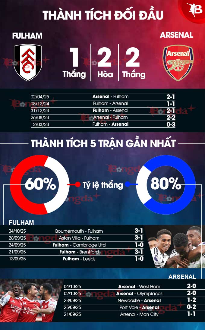 - Cả hai đội cùng ghi bàn: 3 trận đấu gần đây nhất của Fulham tại Ngoại hạng Anh và 3/5 trận vừa qua trên sân khách của Arsenal tại đấu trường cao nhất xứ sương mù đều kết thúc với việc cả hai đội ghi bàn. Chưa kể, 8/10 trận đối đầu gần nhất giữa hai đội cũng xuất hiện bàn thắng ở hai đầu khung thành.