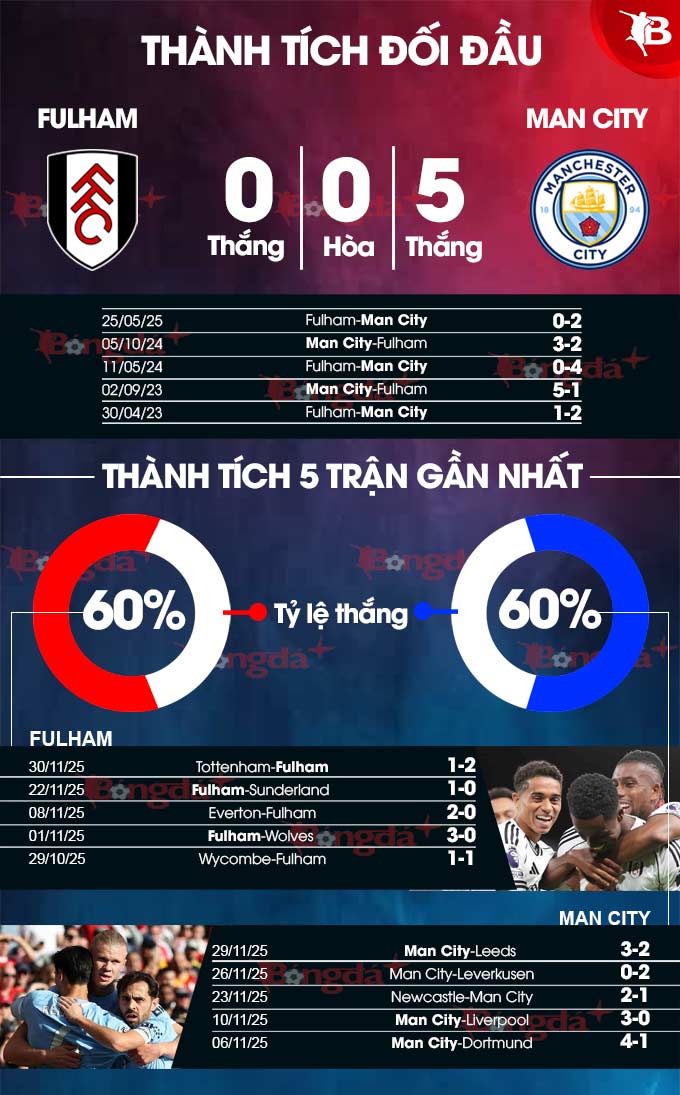 - Lẻ bàn thắng: 5/7 trận đấu gần đây của Fulham kết thúc với tổng số bàn thắng là số lẻ. 4/5 trận gần nhất của Man City xảy ra tình trạng tương tự.