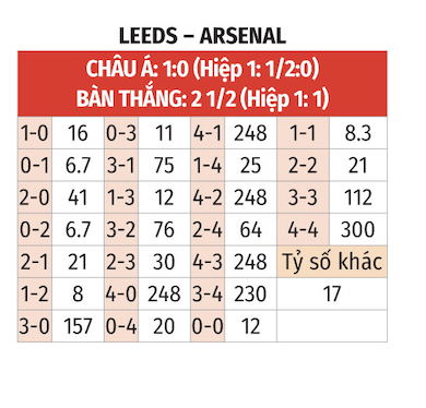 - Tối thiểu 1 bàn hiệp 1: 15/20 trận gần nhất của Leeds có tối thiểu 1 lần lưới rung hiệp 1. 14/20 trận gần nhất của Arsenal có kịch bản tương tự. NHM nên đợi sau 15 phút đầu rồi tin tưởng tỷ lệ nhiều bàn hiệp 1.
