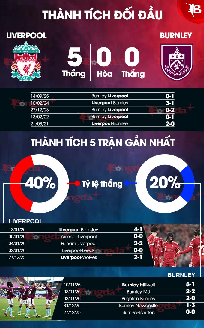 Liverpool đã trở lại cuộc đua Top 4 khi bất bại ở 9 vòng đấu gần đây tại Ngoại hạng Anh mùa này. Trong khi Burnley của Scott Parker đến Merseyside với chuỗi 12 trận chưa thắng tại Premier League (3 hòa, 9 bại) và đang là ứng viên sáng giá cho 1 suất ngược về hạng Nhất Anh.