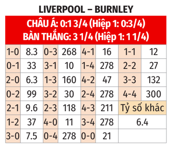 - Burnley thắng theo châu Á: Burnley thắng 3/4 cuộc đối đầu gần nhất; thắng 5, hòa 1, thua 1 ở 7 chuyến làm khách gần nhất tại sân Anfield; thắng 5/8 trận vừa qua. Còn Liverpool thua 4/5 trận gần đây, thua 6/7 trận sân nhà gần nhất.