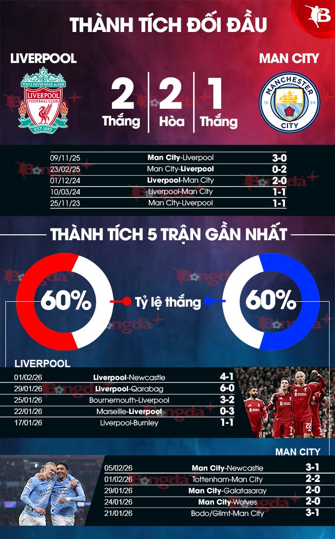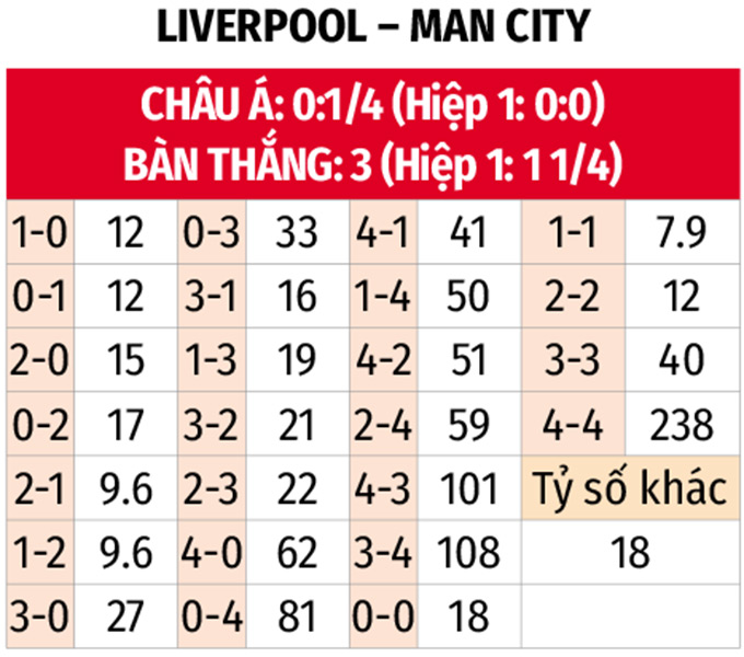 - Nhiều bàn thắng ở hiệp 1: 3 trận liên tiếp gần đây của Liverpool cùng 5 trận vừa qua của Man City đều xuất hiện ít nhất 2 bàn thắng trong 45 phút đầu tiên. 2 trận đối đầu gần nhất cũng có 2 bàn thắng trước giờ nghỉ.
