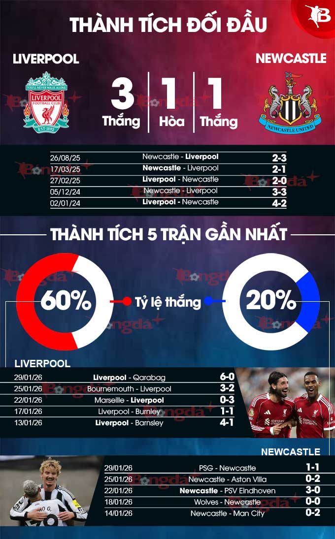 Liverpool có nhiều lợi thế để hạ gục Newcastle lần này. Trước tiên, The Kop bất bại trong 18 trận gần nhất tại Ngoại hạng Anh gặp Newcastle (thắng 13, hòa 5), kể từ trận thua 0-2 trên sân khách hồi tháng 12/2015. Vẫn liên quan đến thành tích đối đầu, thày trò HLV Arne Slot đang hướng tới việc giành chiến thắng cả 2 trận đấu tại Premier League trước Newcastle lần thứ 12. Đây sẽ là số lần nhiều nhất họ làm được điều này trước một đối thủ cụ thể tại giải đấu số 1 xứ sở sương mù (hiện tại là 11, ngang bằng với West Ham).