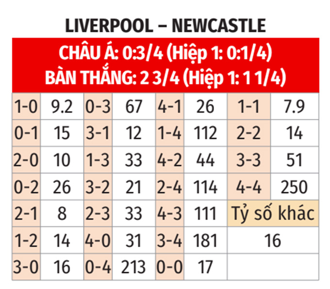 - Liverpool ghi bàn hiệp 1: Liverpool ghi bàn ở cả 3 cuộc đối đầu gần nhất, ở cả 5 trận vừa qua và ở 5/6 trận sân nhà gần đây. Hơn nữa, Liverpool cũng xuyên thủng lưới Newcastle ít nhất 1 lần trong hiệp 1 ở 8/10 trận vừa qua tại sân Anfield.