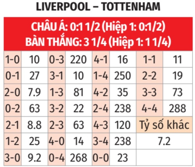 - Lẻ bàn thắng: 5/7 lần đối đầu giữa 2 đội gần đây kết thúc với tổng bàn thắng là số lẻ. Tình trạng tương tự xảy ra ở 7 trận gần đây của Liverpool tại giải Ngoại hạng Anh và 4/5 trận gần nhất của Tottenham.