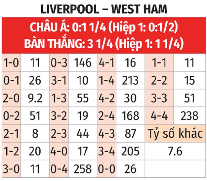 - Ít bàn thắng: Hàng phòng ngự Liverpool đang có mạch 3 trận liên tiếp giữ sạch lưới trên mọi đấu trường, với 2 chiến thắng tối thiểu tại Ngoại hạng Anh. Với West Ham, 4 trận vừa qua của đội khách có tối đa 2 tình huống làm bàn, trong đó có 2 trận hòa 0-0.
