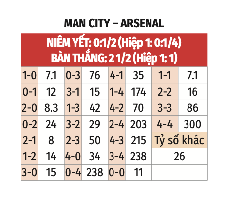 - Tối thiểu 1 bàn hiệp 1: 20/20 trận gần nhất trên sân nhà của Man City có tối thiểu 1 lần lưới rung hiệp 1. 15/20 trận gần nhất trên sân khách của Arsenal có kịch bản tương tự. NHM nên đợi sau 15 phút đầu rồi tin tưởng việc sẽ có nhiều bàn thắng hiệp 1.