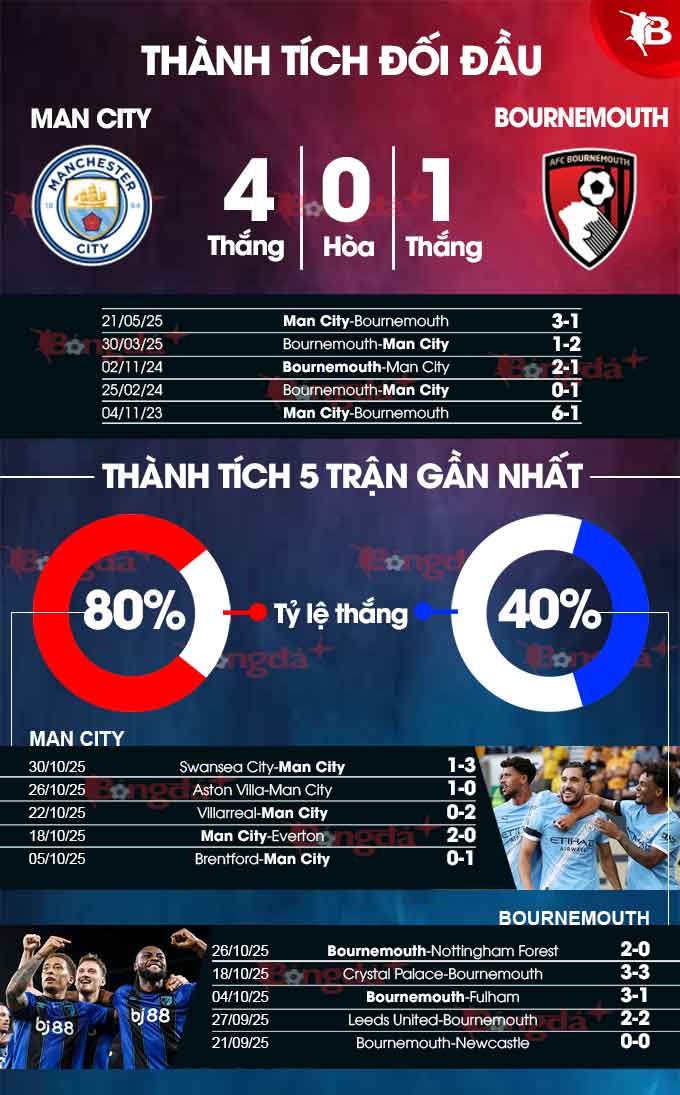 - Trên 3 bàn: 3/4 trận gần đây của Bournemouth đều có tối thiểu 4 bàn. 7/9 trận Man City tiếp đón Bournemouth gần nhất số bàn thắng cũng đều cao hơn 3.