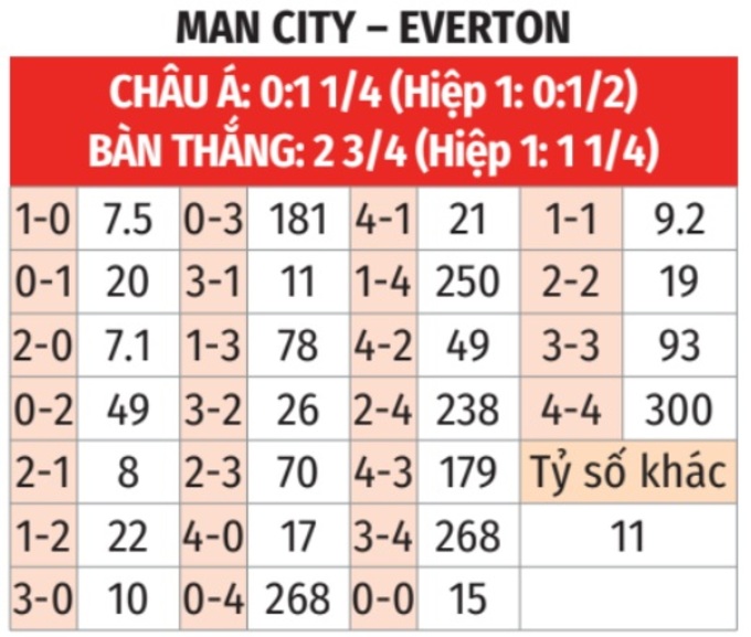 - Tối đa 2 bàn: 5/7 lần gặp giữa 2 đội gần đây đều có từ 2 bàn thắng đổ lại. 3/4 trận gần đây của Man City tại giải nội địa và 10/13 trận sân khách vừa qua của Everton xảy ra tình trạng tương tự.