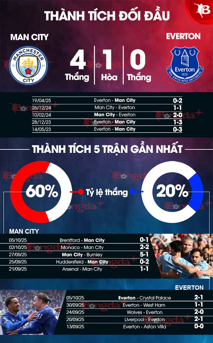 - Chẵn bàn thắng: 5/6 lần gặp giữa 2 đội gần đây kết thúc chẵn bàn thắng. Tình trạng tương tự xảy ra ở 5/6 trận chính thức gần đây của Man City và 5/8 trận mới nhất của Everton.
